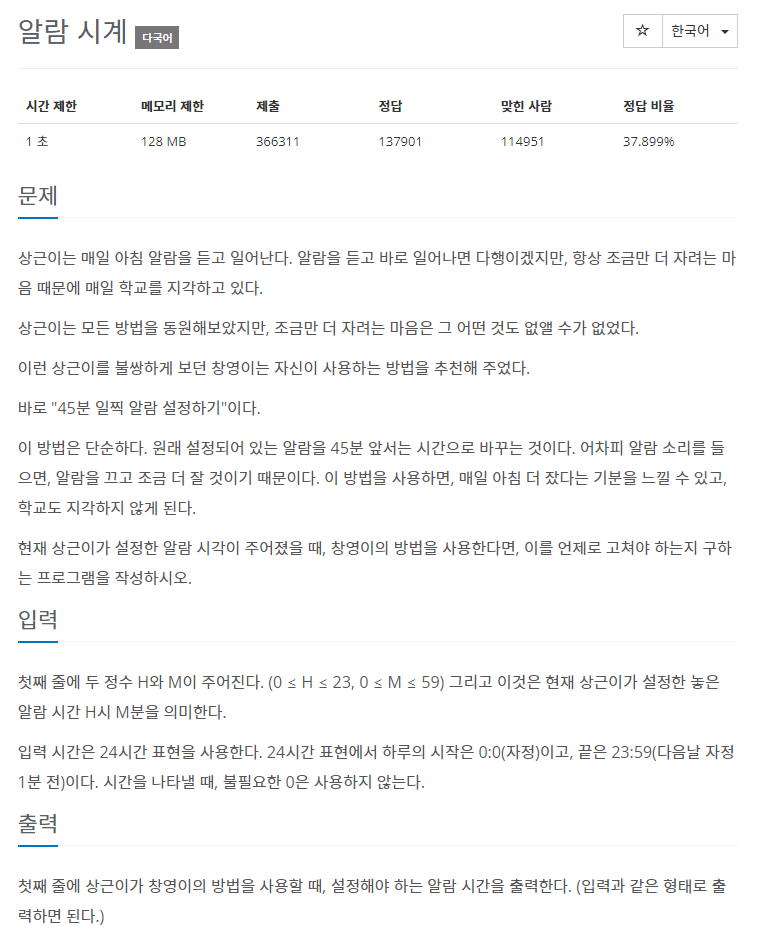 [ 2884번 ] [ C# ] string[] s = Console.ReadLine().Split(); int h = int.Parse(s[0]); int m = int.Parse(s[1]); m -= 45; if(m < 0){ m += 60; h -= 1; if(h < 0) h = 23; } Console.WriteLine($"{h} {m}"); [ Python ] h, m = map(int, input().split()) m -= 45 if(m < 0): m += 60 h -= 1 if(h < 0): h = 23 print("{} {}".format(h, m)) [ C ] #include int main(){ int h, m; scanf("%d %d", &h, &m); m -= 45; if(m < 0..